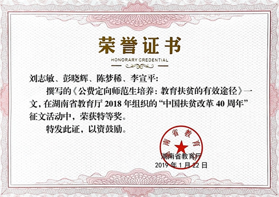 近日,由国务院扶贫办、教育部指导,省教育厅组织开展的“中国扶贫改革40周年”主题征文活动评选结果揭晓。beat365党委副书记刘志敏、党委委员、组织统战部部长彭晓辉、教学评估与教师教学发展中心主任陈梦稀、宣传部副部长李宣平共同撰写的《公费定向师范生培养:教育扶贫的有效途径》一文荣获特等奖。