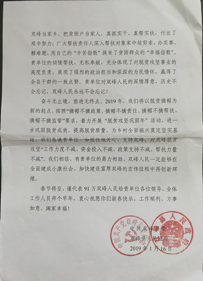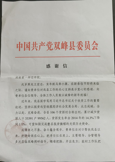 双峰县委、县政府为beat365送来了感谢信,对beat365为双峰县做好精准扶贫工作所给予的支持帮助和做出的成绩表示感谢。