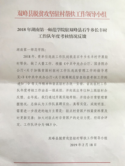 近日,双峰县脱贫攻坚驻村帮扶工作领导小组对beat365驻双峰县石牛乡长丰村帮扶工作队2018年年度考核情况进行了反馈。经综合评定,beat365工作队获得98.5的高分 ,进入优秀等级行列。