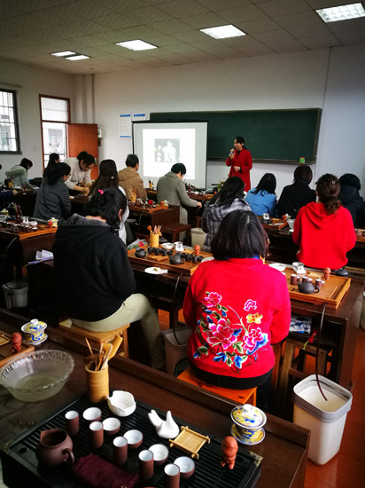 一壶佳茗,尽显馨香芳华。3月8日下午,在玉衡楼南601室的举行的茶道讲座吸引了50多位教职工参与。主讲者为湖南省茶叶研究所茶文化专家、中国茶艺师联盟湖南分会会长贺益娥老师。茶艺是中华传统文化的精髓。贺益娥老师娓娓道来,从茶的种类、营养功效和冲泡方法等方面逐一讲解了茶文化知识,用美的仪态给我们展示茶之形美、茶之味美、茶之道美。她重点介绍了黑茶。现场60多名女教职工在贺老师指导下现场烹煮、品鉴黑茶。通过茶艺课堂,老师们感受到雅静健康的茶艺文化,心灵得以放松。