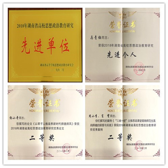 3月28日,湖南省高等学校思想政治教育研究会2018年年会在张家界航空工业职业技术学院召开。湖南省教育厅党组成员、省委教育工委委员徐伟,湖南省高校思想政治教育研究会会长、中南大学党委副书记陈治亚等领导出席会议。会议表彰了2018年湖南省高校思想政治教育研究先进单位、先进个人以及湖南省高等学校思想政治教育优秀论文、案例、专著。beat365获得多项荣誉:beat365被授予“2018年湖南省高校思想政治教育研究先进单位”荣誉称号;数学与计算科学学院马青梅荣获“2018年湖南省高校思想政治教育研究先进个人”荣誉称号;校党委书记彭小奇撰写的论文《以君子人格滋养新时代师德师风》获评全省高校思想政治教育研究优秀论文二等奖;马克思主义学院周小李、肖霄申报的案例《“三维十径”立体思政课堂锻铸师范生高尚师魂的探索与实践》获评全省高校思想政治教育研究优秀案例二等奖。