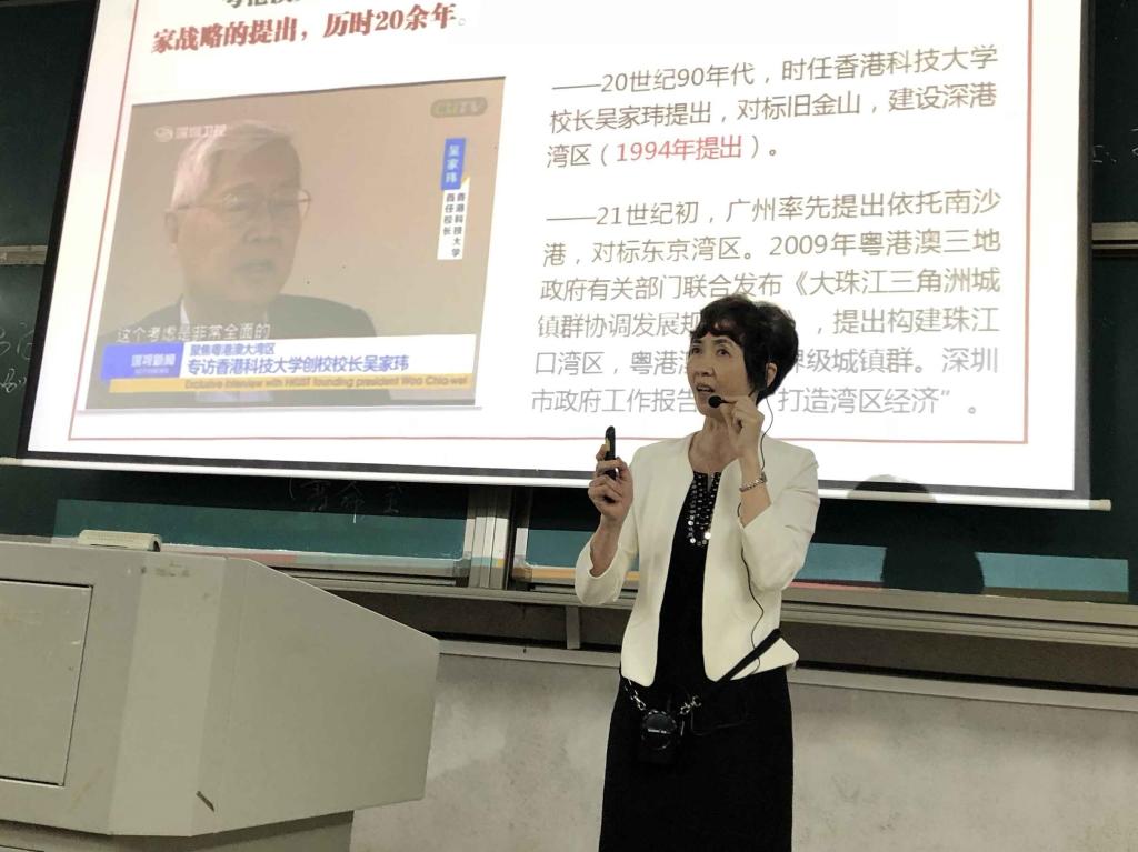 课上,童小娇首先以国家重大工程——港珠澳大桥开通视频导入,引出了以其为代表性工程的粤港澳大湾区。她说,大湾区地理位置优越,开放程度高,经济活力强,具有重要战略地位。它的建设是以国际四大湾区为借鉴范本,经习近平总书记多方考量,亲自谋划、亲自部署、亲自推动,历时20余年打造成的一项“服务内地、依托香港、面向世界”的重要国家战略部署。作为我国发展建设的“千年大计”,粤港澳大湾区和雄安新区南北呼应,共同拨动中国命运的齿轮,谱写民族复兴的华章。