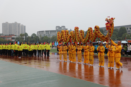随后,2018级学生和2019级学生分别表演了全国小学生广播体操“七彩阳光”和全国中小学生武术操“旭日东升”,飞盘班的同学们模拟了飞盘比赛。