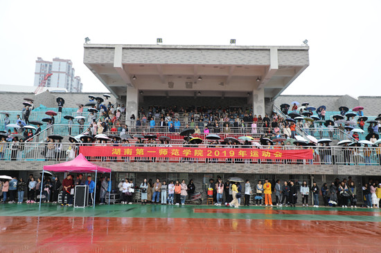 开幕式前,虽然天空中下着淅淅沥沥的小雨,但运动健儿们热情丝毫不减,各学生、教工方阵迈着整齐的步伐,喊着响亮的口号,依次走过主看台,展现出一师人良好的精神风貌。教育科学学院摆出“70”字样祝愿新中国七十周年华诞;文学与新闻传播学院挥舞“文”字旗帜,一套武术操展现他们“少年当立凌云志,报效祖国会有时”的决心;数学与计算机学院以几何代数之美丽展数计健儿的风采;外国语学院学子们身着汉服手执折扇,起舞间扇子一开一合尽显古风魅力;信息工程与科学学院学子们随着电脑提示音的变化潇洒起舞,飞机造型的结束造型别出新意;商学院代表队员高举“阿中哥我爱你”的标牌表达了一师人的拳拳爱国心;音乐舞蹈院的同学们发挥自身的专业优势,用一支民族舞蹈赢得了现场师生喝彩;美术与设计学院学生高举着自制的展画与横幅,高喊出了“我爱一师”的口号;马克思主义学院学子们在恢宏的音乐中,用红黄双面旗再现历史轨迹歌颂伟大祖国;体育学院代表队员表演了花样跳绳,展示了中国武术,引得全场观众热血沸腾。