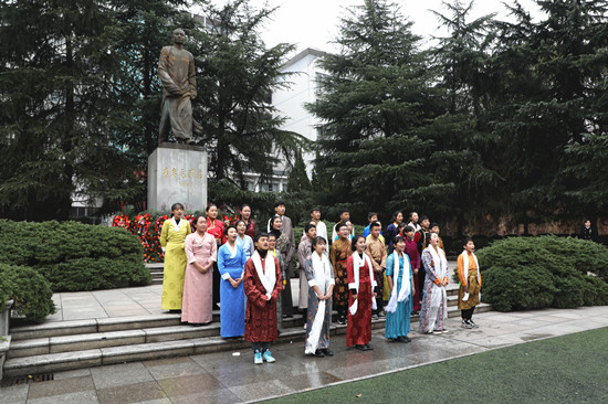 苍松翠柏环绕的青年毛泽东铜像广场庄严肃穆。上午8时28分纪念活动正式开始,校长童小娇发表了纪念活动致辞,并与拉萨师专领导向青年毛泽东铜像敬献了花篮,现场师生向毛主席铜像三鞠躬,寄托他们对主席的无限深情。