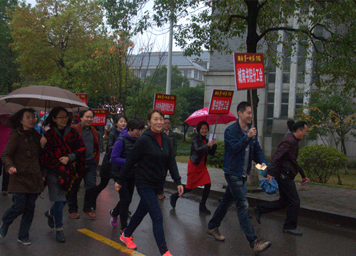 虽然寒风凛冽,阴雨绵绵,但却丝毫没有影响到教职工参与的热情。大家精神抖擞,手撑雨伞,身披雨衣,迈着矫健的步伐有序地从校门口的国旗广场出发。先沿校园右环线的敬夫路、弼时路,绕办公楼,过左环线上的培训楼、艺术楼、益吾路、维汉路,再经图书馆、中轴广场,最后又回到出发点,完成了3.5公里的徒步行程。