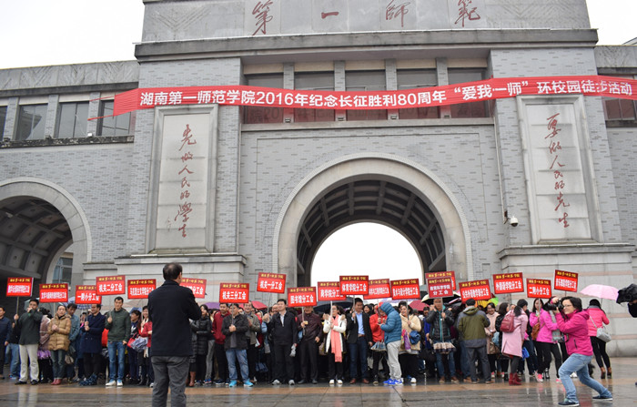为纪念长征胜利80周年,弘扬传承长征百折不挠、不畏艰难的拼搏精神,激发教职工投身学校建设发展事业,倡导健康的生活理念,11月8日,beat365工会举办了以“不忘初心阔步前行,凝心聚力筑梦一师”为主题的环校园徒步活动。在家的校领导和全校18个分工会的在职在岗工会会员参加了此次活动。