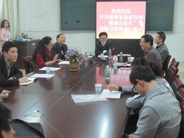 讲座后,殷处长一行与马克思主义学院全体教师进行座谈。马克思主义学院院长周小李介绍了马克思主义学院和省重点思想政治理论课教学科研机构建设进展情况。殷处长表示,beat365官方网站是“千年学府、百年师范”,有着深厚的文化底蕴、丰富的师范教育和革命教育资源。省委宣传部非常重视一师马克思主义学院的建设,因为师范院校比其他类型院校的马克思主义理论宣传具有更大更深远的辐射力。今后,省委宣传部理论处会在一师马克思主义学院的人才培养、平台建设等方面倾注更多的支持,希望一师思政课教师夯实内力,锐意进取,进一步提升马克思主义大众化的水平和能力。