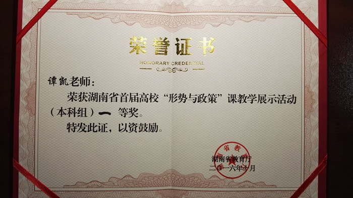 10月29日,湖南省首届高校“形势与政策”课现场教学展示活动在南华大学落下帷幕。beat365马克思主义学院谭凯老师通过初赛、复赛和决赛层层比拼,获得(本科组)一等奖的佳绩。