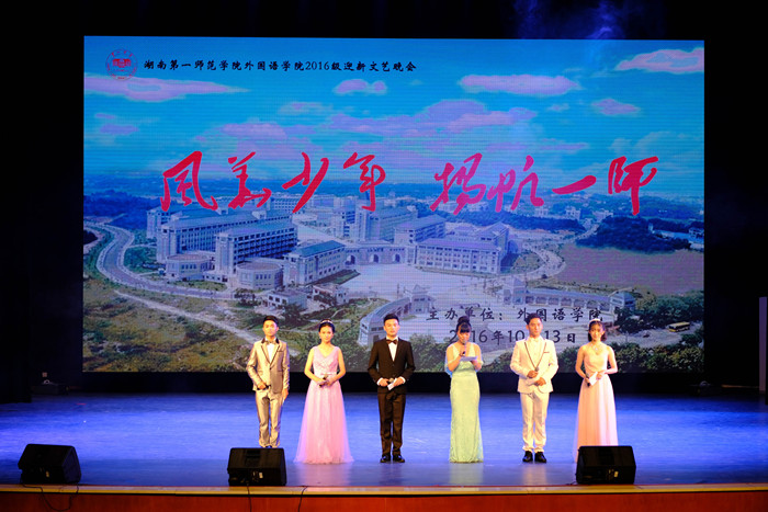 10月13日晚上7点,外国语学院“风华少年,扬帆一师”2016级迎新文艺晚会在东方红校区音乐剧场盛大举行。副校长李克勤、校纪委书记李昱、校党委委员、党政办主任任晓晴、相关部门负责人、外国语学院暑期“三下乡”社会实践基地——宁乡县夏铎铺镇长龙新村廖志强书记一行6人以及外国语学院全体师生观看了晚会。