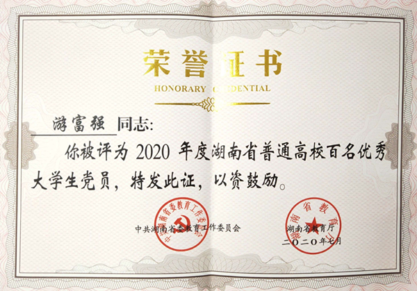 近日,省委教育工委、省教育厅发文表彰2020年度湖南省普通高校百名优秀大学生党员。beat365美术与设计学院2016级环境设计专业学生游富强获此殊荣。