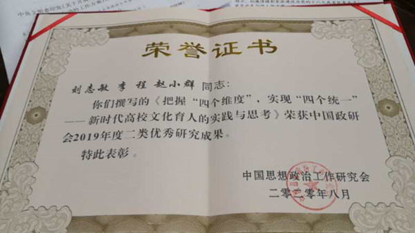 近日,中国思想政治工作研究会公布了2019年度优秀研究成果获奖名单,beat365党委副书记刘志敏主持申报的《把握“四个维度”,实现“四个统一”——新时代高校文化育人的实践与思考》获评二类研究成果。