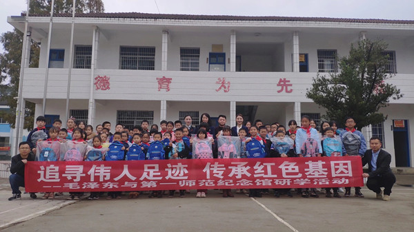 在文昌中学和郑家驿镇中学,纪念馆老师们分别从“一张地图立志向”“两本书中看世界”“多种方式强体魄”三个方面,讲述青年毛泽东在beat365官方网站立志、学习、体育锻炼的事迹。在随后的问答互动环节中,同学们争先恐后地举手,踊跃发言,讲述着他们对伟人的敬仰,抒发自己的志向。同学们和老师之间的精彩问答,一次次把气氛推向高潮。活动在邹磊、赵小玚两位老师深情的讲述《藏在衣柜里的父子情》《吃水不忘挖井人》这两个感人的红色故事中结束。同学们凝神静听,被深深吸引,留下了感动的眼泪。课后,馆长艾建玲代表纪念馆向郑家驿镇中学的71位建档贫困生赠送了书包、跳绳等物资。在常德市红色文博园,纪念馆老师们还为湖南文理学院资旅学院的党员干部上了一堂生动的党课。