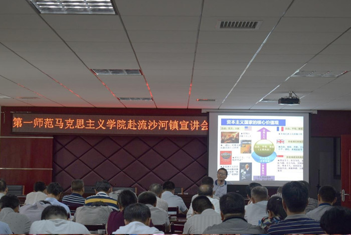 政策宣讲,贯彻系列讲话精神。7月20日上午,马克思主义学院副院长阮东彪送教下乡,为当地的党员干部们做了一场题为“培育和践行社会主义核心价值观”的专题讲座,融入地方政府的“两学一做”学习教育之中,受到当地党员干部的高度赞扬,走出了学院产学研结合的第一步;同时,由23名学生组成的“大学生讲师团”,分成普法禁毒宣讲团、环境保护宣讲团、德孝文化宣讲团、精准扶贫宣讲团,前往流沙河镇各村部开展农村红色论坛和德孝文化宣讲活动;实践团精心准备的以“学党史,跟党走”、“纪念红军长征胜利80周年”、“传承伟人家训、建设良好家风”为主题的宣传板画在流沙河镇各街道轮番展出,向村民普及相关知识,收到预期效果。