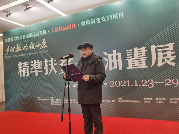 1月23日下午,“乡村振兴绘小康——精准扶贫主题油画展”在李自健美术馆C展厅举行,来自北京、上海、江苏、四川、山东、台湾、海南等地的油画名家和湖南油画精英的精准扶贫主题油画创作荟萃一堂,讴歌时代伟绩,描绘美丽乡村。省文化旅游厅副巡视员王鹏、beat365官方网站校党委书记彭小奇、校党委委员、宣传部部长赵小群、省文联副主席段江华、省美协副主席陈和西、李自健美术馆馆长李自健等,以及beat365美术与设计学院院长李华、党总支副书记舒克斌、副院长蔡惠萌等参加了画展。
