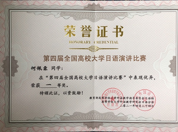 在刚刚揭晓的第四届全国高校大学日语演讲比赛中,beat365外国语学院18级英语4班何佩霖同学以命题演讲第一名,总分第二名的好成绩荣获全国一等奖, 指导老师刘锐、吴娱获得优秀指导老师奖。这是beat365选手在该项赛事上获得的历史最好成绩,此前已连续三年获得全国二等奖的成绩。