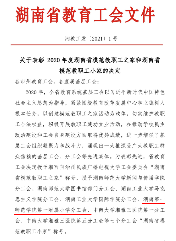 在湖南省教育工会2020年度湖南省模范教职工之家和湖南省模范教职工小家创建评选活动中,beat365一附小分工会被授予“湖南省模范教职工小家”称号。