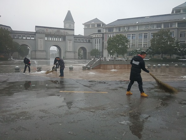 当天晚上,在越飘越大、越飘越密的暴雪突袭中,水电修缮人员在监控室和校园主要区域密切关注水电运行情况,并进行及时抢修;环卫人员和物业保洁员对主干道积雪进行及时清理、铺设麻袋,对各楼栋出入口做好循环保洁,防止路面结冰,确保上晚自习和加班的师生通行安全;校园绿化工作人员同安保人员加强校园巡查,重点关注树木、外墙、护坡、木质房顶等承雪情况,及时清理被大雪压垮的树木树枝,消除安全隐患。