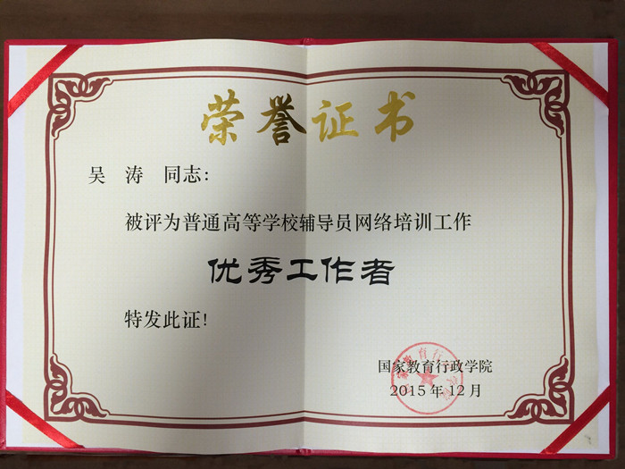 2015年12月26日—30日,2015年全国普通高等学校辅导员队伍建设研讨班暨辅导员网络培训总结会在国家教育行政学院举行,来自全国108所高校共计220余人参加了会议。beat365学生工作处学生管理科科长吴涛参加了会议。在此次会议上,beat365被评为“普通高校辅导员网络培训优秀组织单位”(湖南省仅beat365获得此荣誉),吴涛荣获“普通高校辅导员网络培训优秀工作者”荣誉称号。