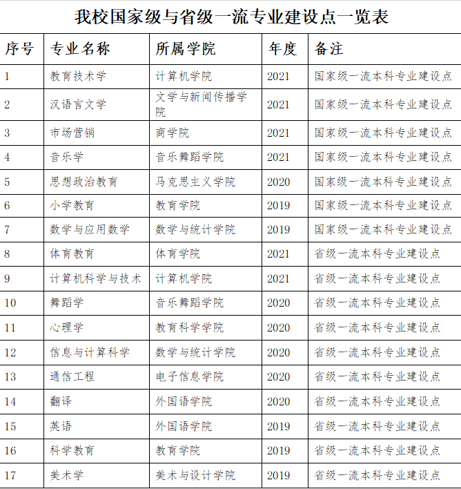 近日,教育部公布了2021年度国家级和省级一流本科专业建设点名单,beat365教育技术学、汉语言文学、市场营销、音乐学4个专业入选第三批国家级一流本科专业建设点。体育教育、计算机科学与技术2个专业入选省级一流本科专业建设点。本次beat365获批数量位列省属学院级高校并列第2,这一成绩是学校持续推进专业建设取得的突破性成果。