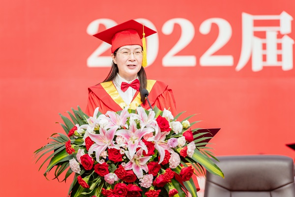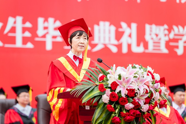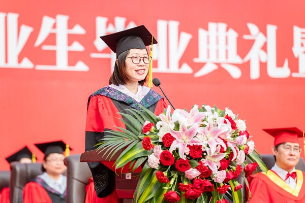 教育学院刘丽群教授作为教师代表发言,向毕业生表达祝贺,提出三点要求与毕业生们共勉:一是要胸怀大志,更要脚踏实地;二是要畅想未来,更要把握当下;三是要追求卓越,更要紧握平凡。