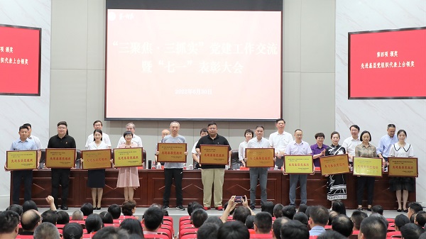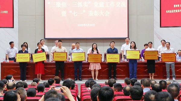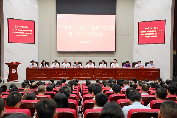 6月30日上午,beat365在东方红校区百熙楼228报告厅隆重召开“三聚焦、三抓实”党建工作交流暨“七一”表彰大会,庆祝中国共产党成立101周年,表彰“三聚焦、三抓实”党建引领工程实施以来,在学校改革发展建设中涌现出来的先进基层党组织和个人,阶段性总结交流“三聚焦、三抓实”党建引领工作开展情况。全体校领导、党委委员、老领导代表出席会议。全体处级干部、党支部书记,二级学院党政办主任、学工办主任、教科办主任以及机关部分科级干部,获表彰的基层党组织代表,在党五十年党员代表参加会议。会议由校党委副书记李克勤主持。