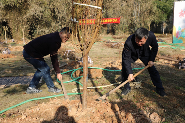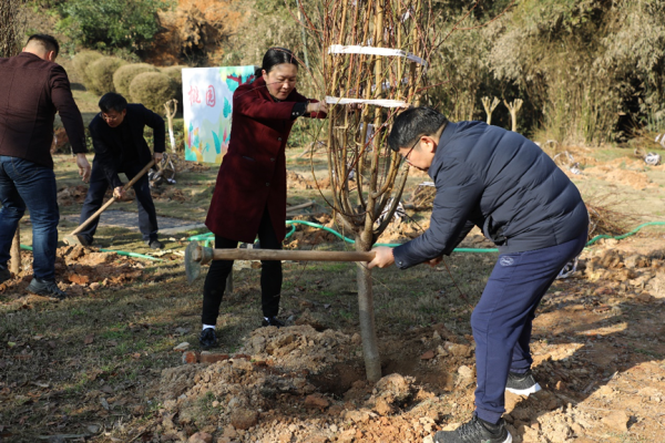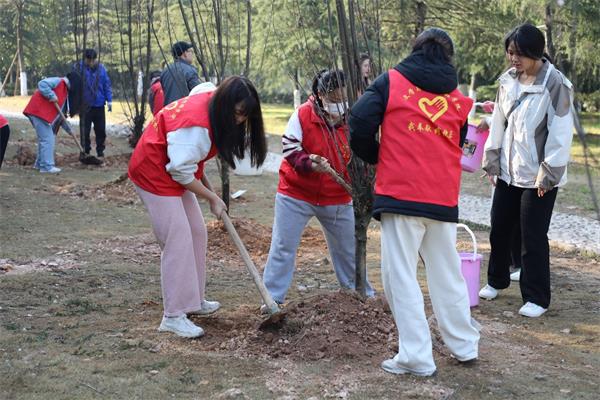 在玉衡楼东南角的绿地上,党委书记罗成翼、校长胡穗正在为刚刚安放好的树苗填土、浇水。校园雪松林东北角,身着红马甲的三名学生志愿者们正在将一颗李树立入已挖好的树坑中。植树现场呈现出一派热火朝天的景象。100余名师生员工挥锹扬锄、护苗填坑、踏土扶苗、提桶浇水……大家齐心协力,个个热情高涨、干劲十足。经过一番辛勤劳动,一排排新栽好的桃树和李树在春日里迎风招展,为美丽校园增添了勃勃生机。