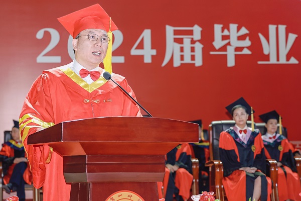 胡穗代表学校向2024届毕业生表示热烈的祝贺和美好的祝愿,向为他们成长成才付出辛劳的各位老师和家长,致以衷心的感谢和崇高的敬意。他深情回顾了毕业生在校的成长历程,四年前,同学们选择了一师,融入了一师,也助力了一师的发展。四年来,师生一起见证了学校第二次党代会的胜利召开,见证了“四个一师”新篇章的徐徐展开,见证了学校日新月异的发展变化,尤其荣耀的是,见证了习近平总书记来校考察的重大历史时刻。作为一师学子,在中国式现代化建设新征程中,要牢记好、领会好、践行好习近平总书记的殷殷嘱托。胡穗叮嘱同学们:一要争做爱国奉献的新青年,立志报国强国。向优秀校友学习,无论身处什么岗位,都能够胸怀报国强国之志,将个人理想融入国家发展,在最美的事业中绽放青春,在为祖国、为人民的服务中更好地实现人生价值。二要争做不懈奋斗的追梦人,勤于终身学习。在社会这个大课堂中汲取更多学识智慧,锤炼更加过硬本领,让不懈奋斗成为人生最鲜明的底色,让终身学习成为改变人生长度、拓展人生宽度、增加人生厚度的一种生活方式。用本领托举梦想,用奋斗开创明天。三要争做勇立潮头的开拓者,勇于创新创造。牢记校训“要做人民的先生,先做人民的学生”,俯身躬行,向人民学,向实践学,在实践中获得创新创造的灵感和动力;牢记校风“实事求是,不自以为是”,不固步自封,不随波逐流,在各自领域乘风破浪、勇立潮头;拿出毛主席当年“我们不干,谁干?”的勇气与魄力,主动拥抱新时代,抓住新机遇,找寻和探索属于自己行业的新属性、新联系、新规律,奋力创造不一样的未来。