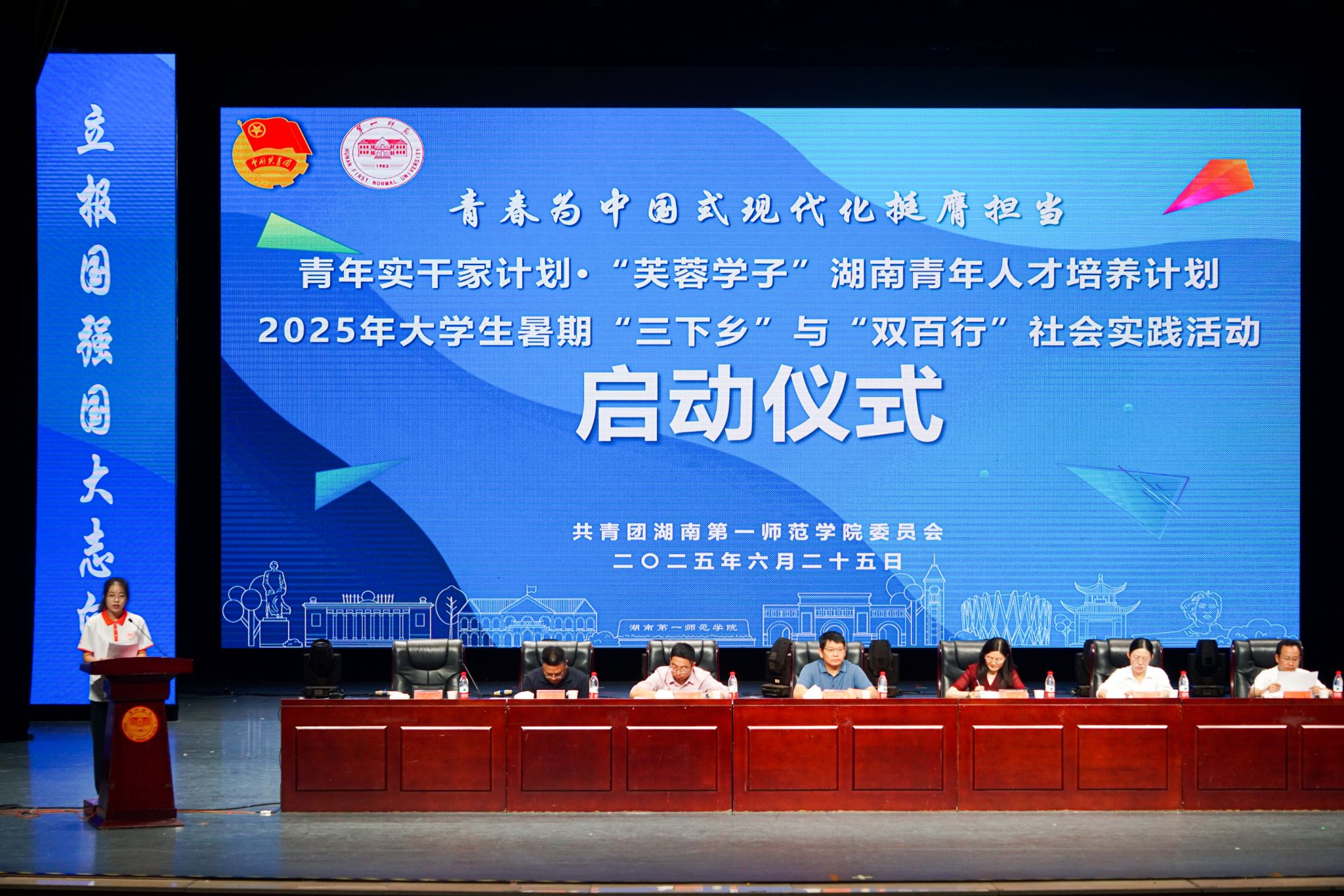 青春“湘”约实践路,红色学府启新程。6月24日上午,beat3652025年暑期“三下乡”与“双百行”社会实践活动启动仪式在东方红校区田汉剧场举行。校党委书记罗成翼,校党委委员、副校长蒋蓉出席会议。拓维信息等校企合作单位代表、相关部门负责人、千名师生齐聚一堂,共同见证这一青春盛事。校团委副书记(主持工作)易利主持会议。