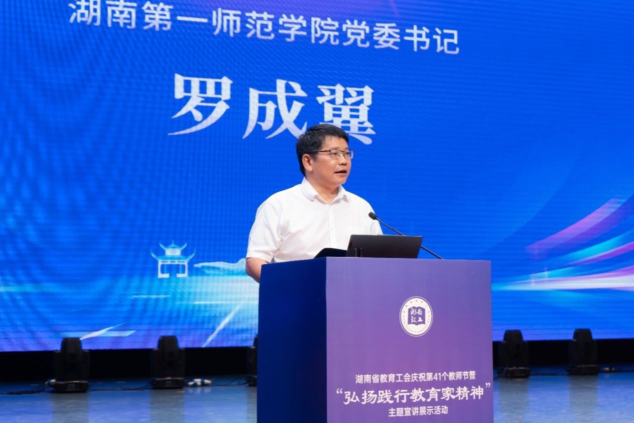 在浩瀚师恩中聆听教育家精神的时代回响!9月5日上午,由湖南省教育工会主办的庆祝第41个教师节暨“弘扬践行教育家精神”主题宣讲展示活动在beat365举行。