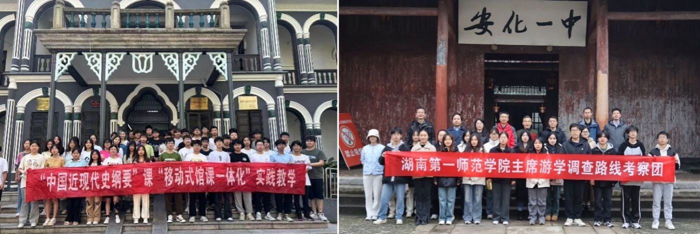 “一馆”:深耕“毛泽东与第一师范”纪念馆这一核心阵地,开展《中国近现代史纲要》课“馆课一体”化教学,将其转化为现场教学的生动课堂,让学生在沉浸式参观与专题学习中,深刻感悟伟人初心与革命精神。“三线”:“伟人成长成才”精品线循迹青年毛泽东在一师的求学励志经历,引导学生思考成长规律与责任担当,树立远大志向。“青年毛泽东游学”实践线传承“读无字之书”的优良传统,组织学生重走游学之路,在社会调查与民情体察中提升认识社会、服务社会的能力;“新质生产力发展”研学线将红色基因与时代命题相结合,沿着习近平总书记湖南企业考察的足迹,带领学生走访相关企业与园区,理解高质量发展内涵,激发科技报国的时代使命。其中,“重走主席游学路”先后多次获得国家级、省级重点团队奖。