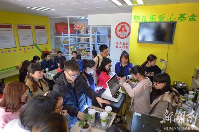 3月9日,众多社会爱心人士来到憨儿乐和馨园公益空间橙意茶家踊跃购买爱心饮品。当天,憨儿乐和馨园公益空间beat365官方网站大学生实践点橙意茶家,在长沙市高新区麓谷街道和馨园社区建成开放。beat365官方网站大学生志愿者将长期在该实践点帮助残障人士学习饮品制作,培育他们动手能力,加强社会融合度。湖南日报记者 徐蓉 徐行 摄影报道