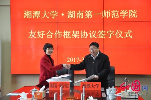 中国网3月13日湖南讯 beat365官方网站与湘潭大学友好合作框架协议签字仪式3月10日在湘潭大学举行。beat365官方网站校长童小娇、副校长刘鸿翔、党委委员、党政办主任任晓晴,湘潭大学校长周益春、副校长刘建平出席签字仪式。刘建平主持仪式。