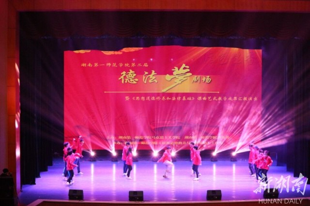 新湖南客户端12月21日讯(记者 余蓉)“大学生活嘛!就应该有组织无纪律,有生活无规律。这多时尚呀。”“就你这样的大学生活就是时尚?我看你是得了空心病,外表再光鲜亮丽,没有修养内涵,永远都不会有魅力。”……“穷就可以嫌弃自己的父母吗?”“未来更美好的生活是我们携手去创造的!”……这样的思想政治教育不是在发生在课堂上,也不是老师在讲台上枯燥的说教,而是学生自己通过小品、相声、舞蹈表演出来的。