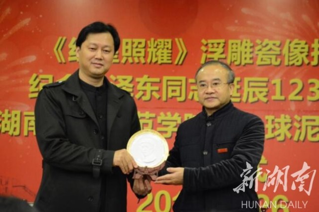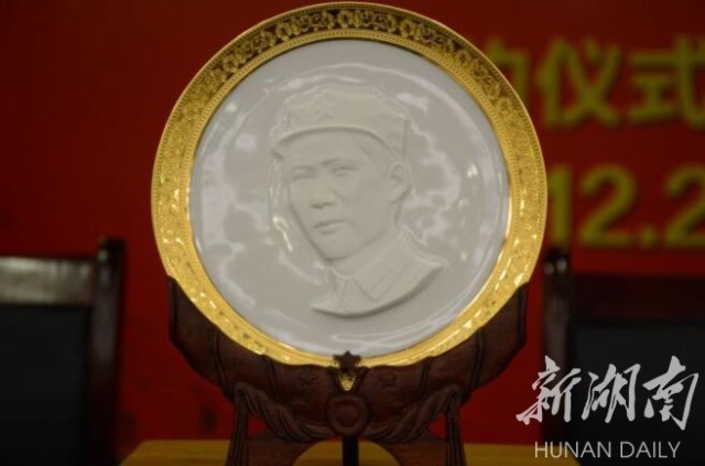 为纪念毛泽东同志,著名红色雕塑家张松鹤之子张方和湖南大球泥瓷艺有限公司滕召华先生联袂,采用浮雕方式将延安时期毛泽东同志戴红星八角帽的经典影像进行再创作,烧制出了一款全新的浮雕作品——《红星照耀》。