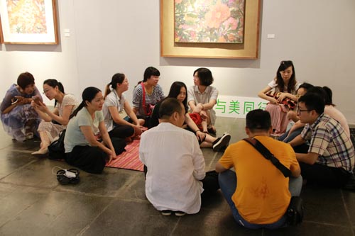 教育部艺术学科专家罗炜(左三)、国家心理咨询师罗波夫(左四)在画展现场与家长交流“生命的不可思议——从蔡皋画里品味家长成长”