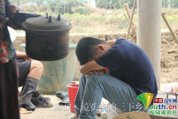 何时来支教时累得坐在石头上眯一会儿。中国青年网通讯员 肖依婷 摄
