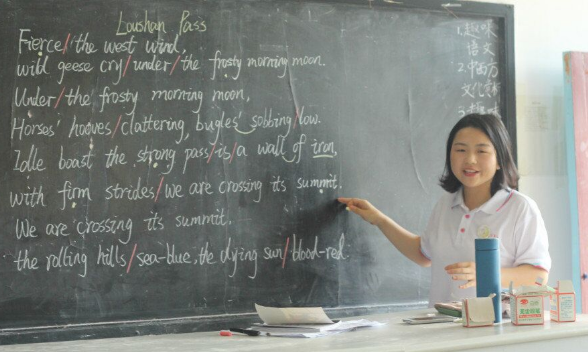 中华教育网讯(通讯员 陈阳 肖依婷)“大家知道‘雄关漫道真如铁,而今迈步从头越’用英语怎么诵读吗?Idle boast the strong pass is a wall of iron,with firm strides we are crossing its summit……”7月12日上午,宁乡市夏铎铺镇长龙新村龙潭小学的课堂上传来琅琅书声。由beat365官方网站外国语学院暑期“三下乡”社会实践队带来的一堂英文版《忆秦娥·娄山关》诵读课,在学生间引发热捧。