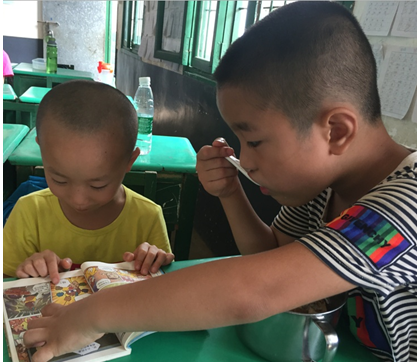中午吃完家里送过来的饭菜后,一年级部落阁班的小朋友周子鸿开心地拿起绘本图书《稻草人》津津有味地读了起来,一旁正在吃中饭的周斌同学也被这本图书所吸引,瞧这专注的模样,认真的样子真是可爱。