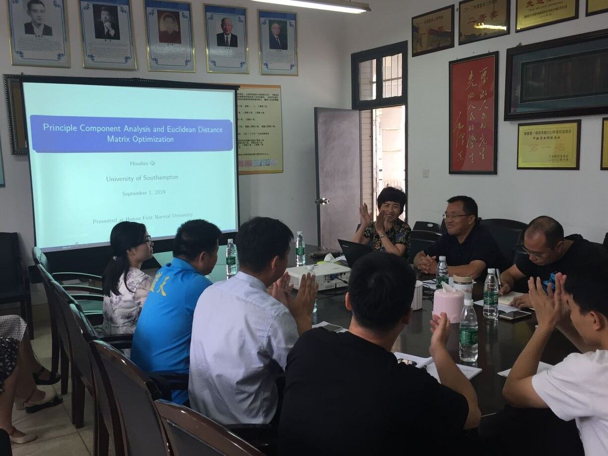 9月1日上午,戚教授在数学与计算科学学院会议室面向教师做了题为主成份分析和欧几里得距离矩阵优化的报告,校长童小娇主持。戚教授主要介绍了主成份分析与主成份坐标分析,特别是它们与优化之间的联系。当数据缺失时,鲁棒PCA在数据恢复上成为主要方法,特别的,在适当条件下,其数据的恢复效果非常好。与此对比,而PCoA在这方面并没有取得很好的进步,而欧几里得矩阵优化对其进一步发展上起到重要作用。