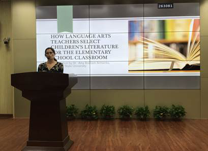 Amy教授分别从当代美国小学的教育现状,美国小学现阶段流行的各种教学绘本,以及中国儿童文学绘本在美国课堂的接受状况为切入口,详细介绍了当代美国小学生不同阶段的阅读素材,小学教师对儿童文学阅读读物的选用等情况,重点向师生们阐述了美国课堂教学中如何对小学生进行性别角色教育和爱国主义情怀渗透的问题。最后她总结了儿童文学教育的意义,即帮助儿童形成正确价值观、完成性别角色启蒙教育以及爱国情怀的培养,促进儿童的健康成长。此系列讲座给在座的师生留下了深刻的印象。