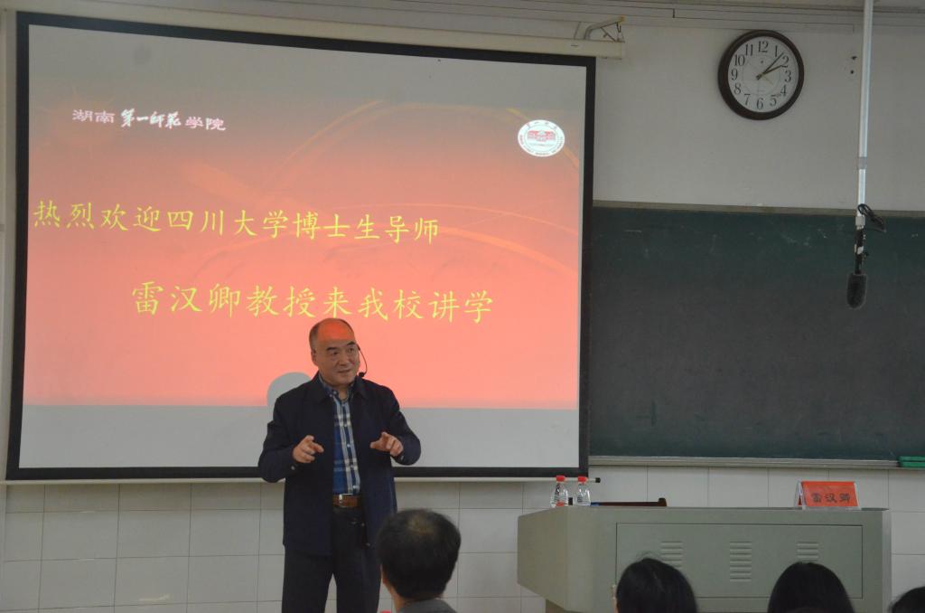 11月12日下午,四川大学汉语史研究所所长、博士生导师雷汉卿教授在怀中南201教室做了题为“元典阅读与文化自信”的讲座。讲座由文学与新闻传播学院院长龙永干主持,副院长葛春蕃、语言学教研室部分教师及汉语言文学专业学生共130多人参加。
