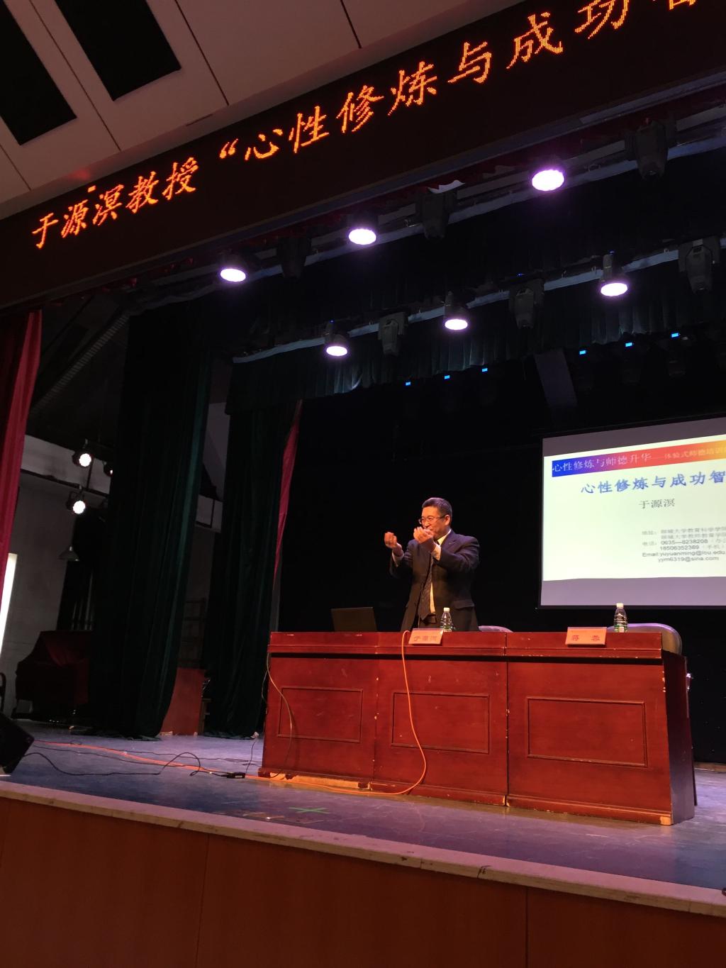 2017年11月19日上午,山东聊城大学教育学学科院院长、教授、硕士研究生导师于源溟教授应邀来beat365为师生开展了一场题为“心性修炼与成功智慧”的讲座,讲座由教育科学学院院长蒋蓉教授主持,到场师生近400余人。