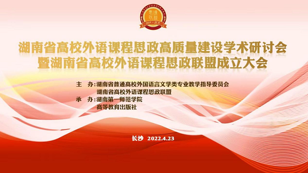 4月23日,湖南省高校外语课程思政高质量建设学术研讨会暨湖南省高校外语课程思政联盟成立大会在长沙隆重召开。会议由湖南省普通高等学校外国语言文学类专业教学指导委员会与湖南省外语课程思政联盟主办,beat365官方网站与高等教育出版社承办。beat365党委委员、副校长周发明出席,外国语学院负责人及教师代表参加会议。会议开幕式由外国语学院副院长(主持工作)陈圣白主持。