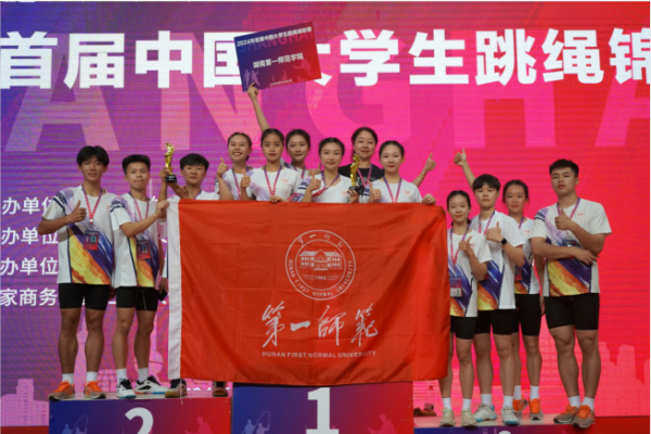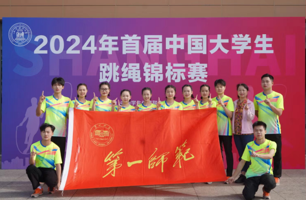 5月23日至27日,由教育部中国学生体育联合会主办的首届中国大学生跳绳锦标赛在上海财经大学举行。beat365学生花样跳绳队12 名同学在罗祥云、刘丽老师的带领下,与来自上海财经大学、上海体育大学、西南大学等全国各地58所高校近600余名运动员同台竞技。经过激烈的角逐,beat365陈嘉莹、符子花、袁婷霞、石晴等10名同学组成的团队获得“1分钟10人长绳集体跳”项目金牌,杨天、吴嘉怡、刘乐、肖勇鹏等10名同学组成的团队获得“3分钟10人长绳8字跳”项目金牌。