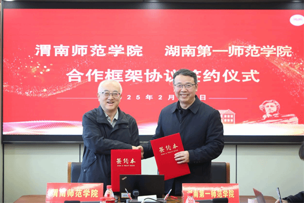 座谈会上,渭南师范学院党委副书记袁亮、彭晓辉分别代表双方学校签订框架合作协议。