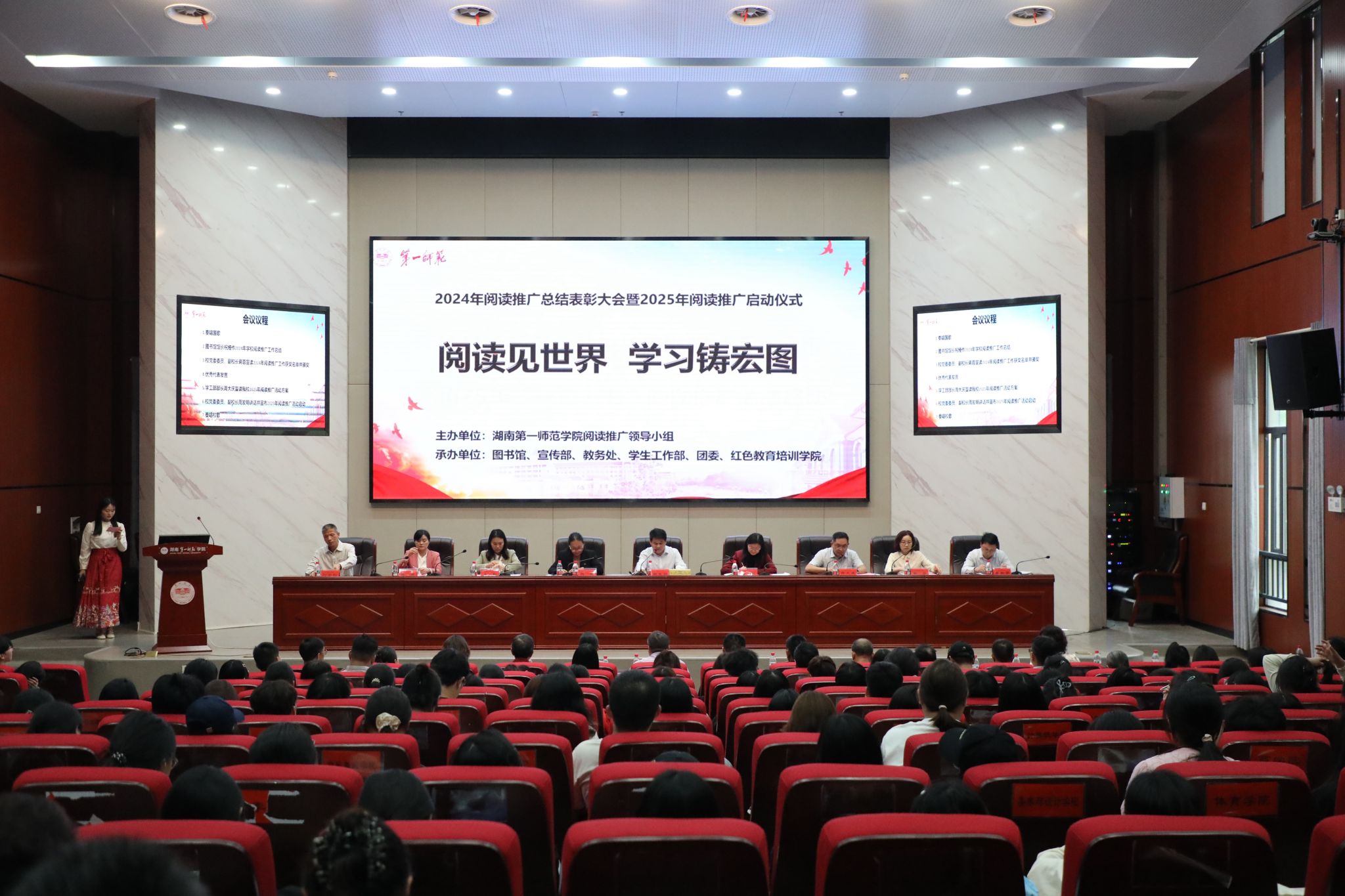 随着庄严的国歌声响起,仪式正式拉开帷幕。会议全面总结回顾了2024年阅读推广工作的丰硕成果,并对优秀阅读推广人、书香校园建设先进集体、优秀读书报告获奖者等进行表彰。获奖教师代表李豪杰结合学生管理实践,分享以阅读助力育人的经验;学生代表罗佳璇、何璐则分别从书香班级建设、个人阅读感悟出发,生动诠释“阅读育人”的实践路径,引发全场强烈共鸣。