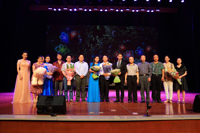 热情狂野的《卡门》五重奏拉开了本场音乐会的序幕。紧接着,带着狂澜般情感的贝多芬《热情奏鸣曲第三乐章》,让人仿佛看到了“在花岗石的河道里的火焰的巨流”。肖邦《第一叙事曲》亦如暴风骤雨般的慷慨悲壮。毕琼文老师与Patrick老师、王文君老师共同演奏的查尔斯曲《三重奏》让观众耳目一新,意犹未尽。“翩翩的在半空里潇洒”,毕琼文老师编曲、周芳老师独唱的《雪花的快乐》让观众感受到了大自然的音籁、灵魂的交响。毕琼文老师与其父亲携手带来的《秦川抒怀》使人不由得联想到“八百里秦川”的沧桑变迁以及西北汉子的奋进、豪迈之情;《扬鞭催马运粮忙》使人眼前浮现出丰收以后的农民驾着满载粮食的大车,喜气洋洋地向国家交售公粮的情景。父女俩非常默契地运用音乐语言将两部作品的情感内容表现得淋漓尽致。长笛独奏门德尔松《乘着歌声的翅膀》以清畅的旋律和由分解和弦构成的柔美的伴奏,展现了一幅温馨而富有浪漫主义色彩的图景。音乐会最后以毕琼文老师与Patrick的双钢琴演奏圆满结束。